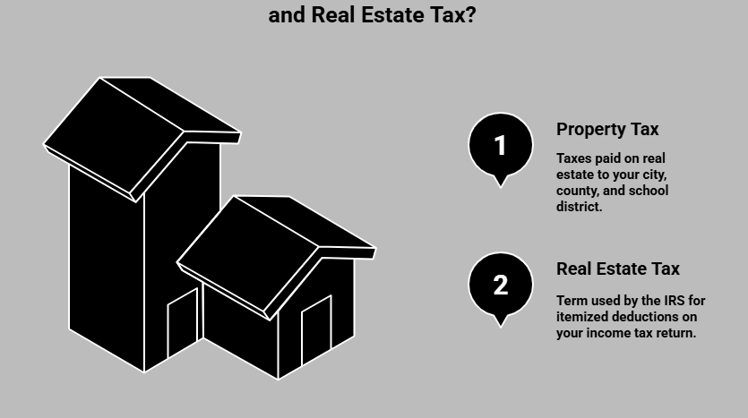 Technically, real estate tax is the term used by the IRS and government agencies to refer to taxes levied on land, luxurious property, and buildings. Property tax, on the other hand, is more of a general umbrella term.